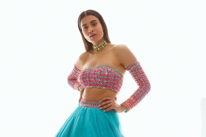 AQUA BLUE AND GREEN SKIRT WITH CAPE AND BUSTIER