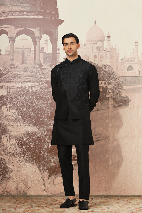 Black Aura Embroidered Raw Silk Kurta Bundi Set