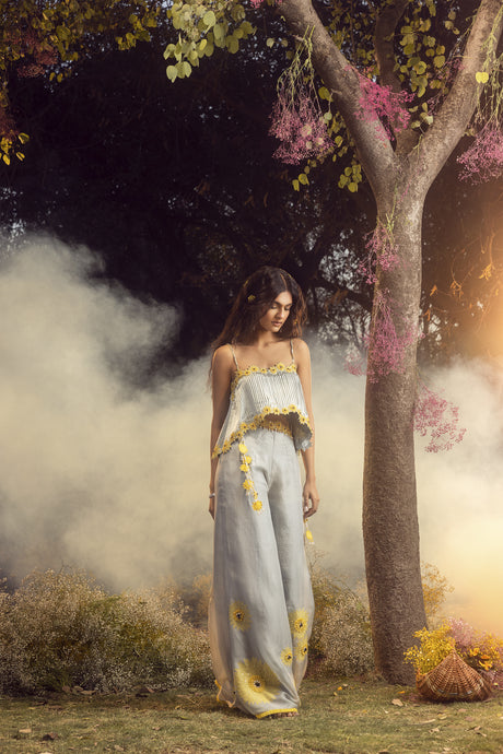 BLUE GREY PALAZZO WITH PLEATED CROP TOP WITH BELT