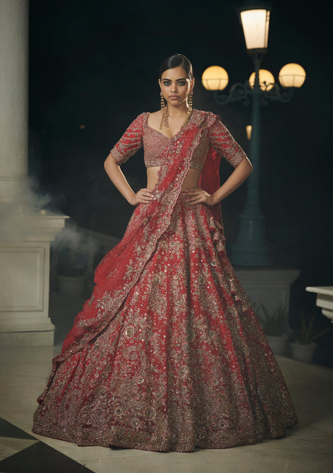 aliyah Burgundy and Brick Red Ombre Raw Silk Bridal Lehenga Set