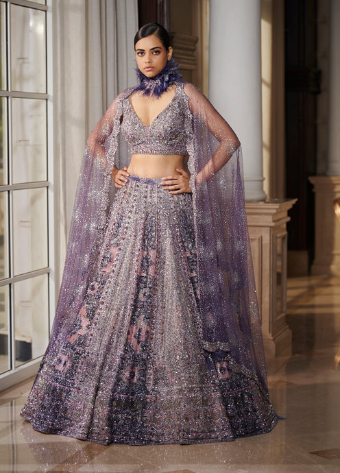 Pink Lavender Mocha Ombre Bridal Shimmer Tulle Lehenga Set