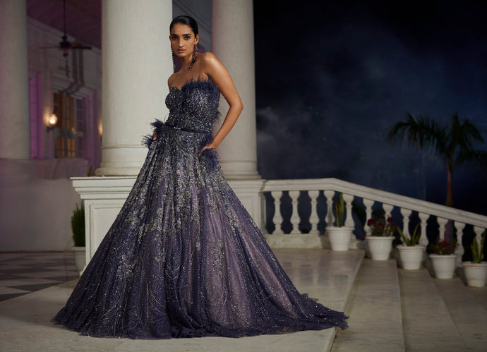 Soft Humor Berry Blue Shimmer Tulle Bridal Lehenga Set