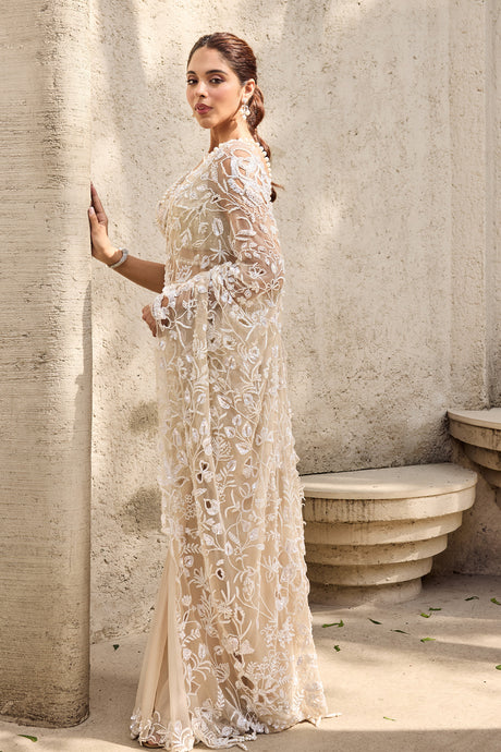 Ivory Organza, Georgette Pearls, Embroidery Scoop Hand Pre-draped Saree Set