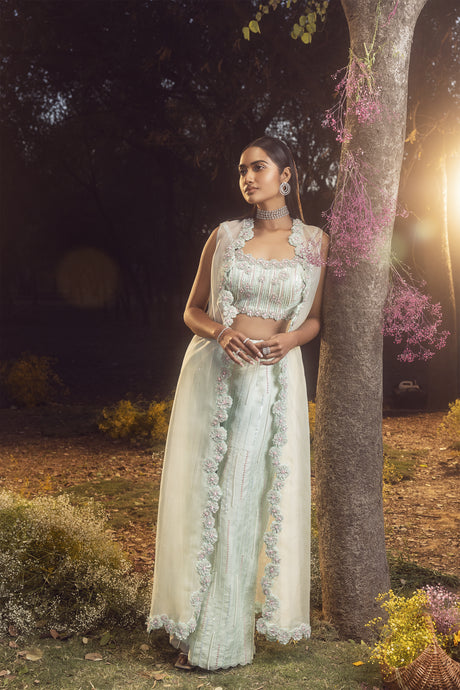 • MINT GREEN TROUSER WITH PLEATED CROP TOP AND JACKET SET