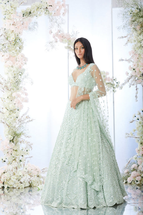 Tea Green Floral Sequin Lehenga Set