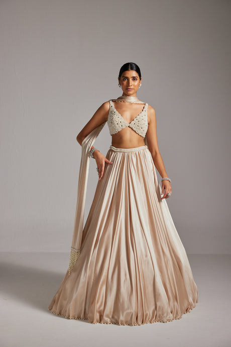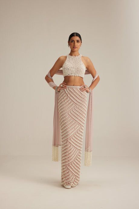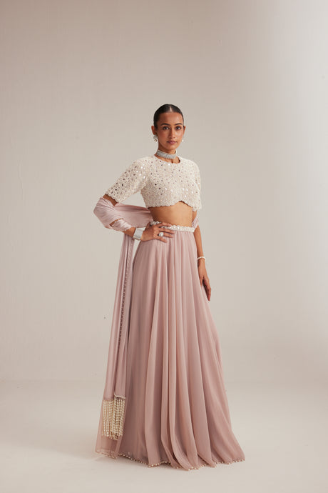 Ash Pink Pearl Drop Lehenga with high neck blouse