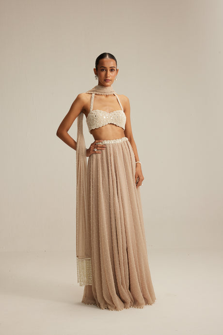 Light Beige High Neck Organza mirror and pearl lehenga set