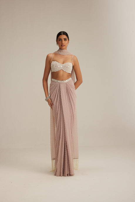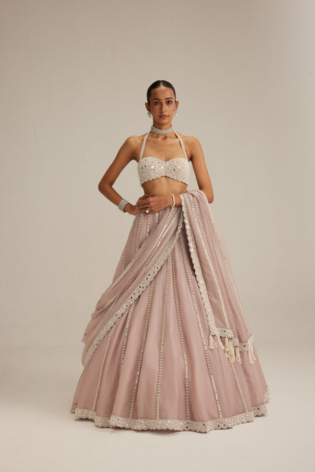 Ash Pink Pearl Mirror linear Lehenga with V neck Blouse