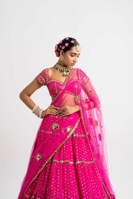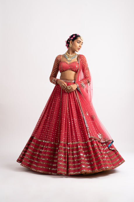 Deep Coral Silk Organza Heavy Dupatta Lehenga Set