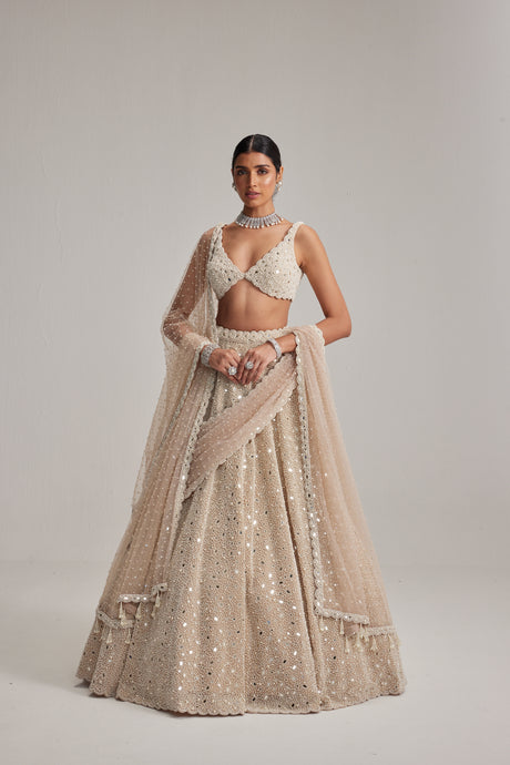 Light Beige Dense mirror and pearl lehenga set with High neck Blouse and Dupatta