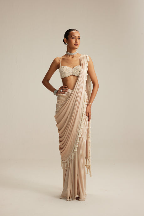 Light Beige Pearl Drop Multi Tier Lehenga Set.