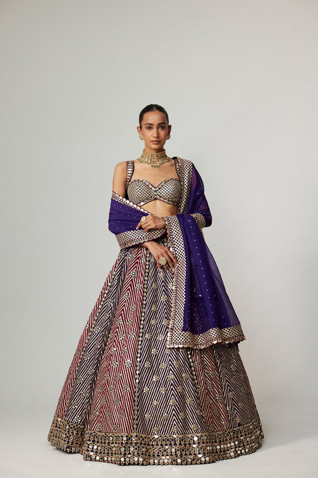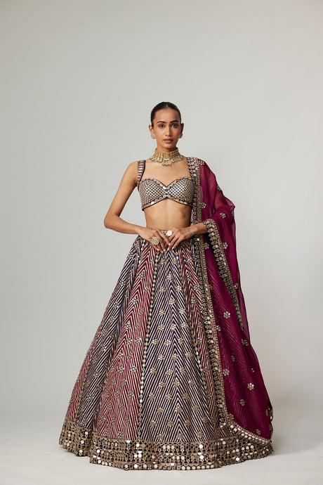 CRANBERRY MULTICOLOR LINEAR LEHENGA WITH SWEETHEART FULL SLEEVE BLOUSE.