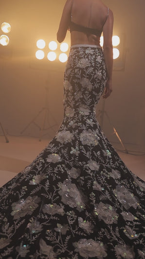 Featuring our gorgeous mermaid set ELINOR with entwined floral vines running throughout the skirt. This skirt is paired with a stunning bustier with crystal detailing. The skirt is purely hand embroidered with sequins, cutdana and pearls on a metallic organza fabric. Elinor set come with a huge trail perfect for your cocktail.