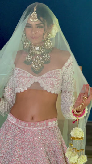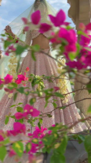 Our Emery Bridal lehenga is an intricately hand embroidered 20 kalis rose color pure raw silk lehenga set with magnificent flare and is ornated with our signature pearls, crystals and glass beads. This set comes with double dupattas one soft net dupatta with heavily embroider borders and a beautiful veil dupatta with a huge floral embroidered trail.