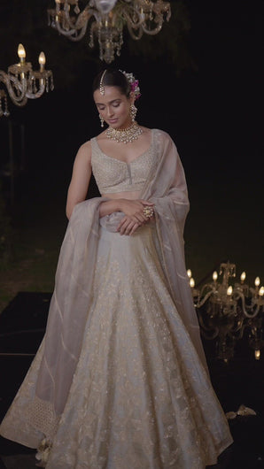 This lehenga set features traditional bugle beads embroidery on a silver base. The outfit is paired with an embroidered rounded v-neck blouse and a four-sided embroidered tissue organza dupatta.