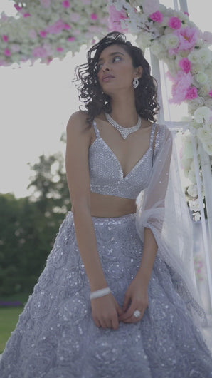 This lehenga set features tonal three-dimensional flowers with sliver sequin and crystal embroidery. Th ensemble is paired with all over icy grey beaded sequin & crystal blouse with a matching net dupatta.