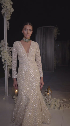 This fish cut gown features all over sequin, crystal and pearl embroidery on an ivory net base. The outfit has a sheer back and fully embellished sleeves.
