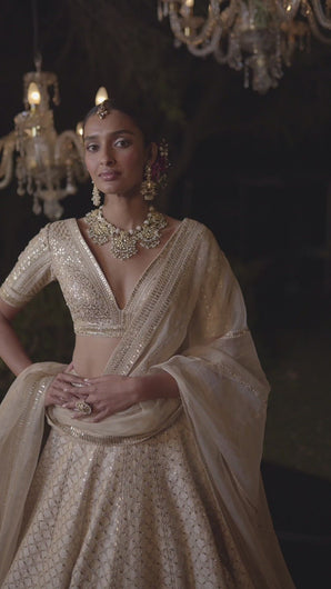 This ivory gold lehenga set features conventional and refined gota patti embroidery in subtle colour. The outfit is paired with a v-neck blouse and an ivory tissue organza dupatta.