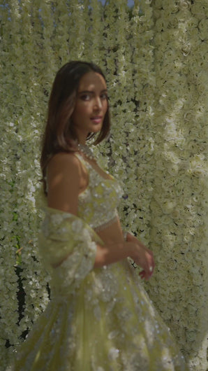 This lime yellow lehenga set features all over assorted floral white sequin embroidery. The blouse comes with tassels and the outfit is paired with a matching net dupatta.