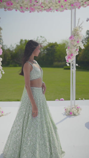 This lehenga set features seashell inspired pattern, tonal coloured sequin embroidery. The outfit is paired with an all over sequin blouse and a matching net dupatta.