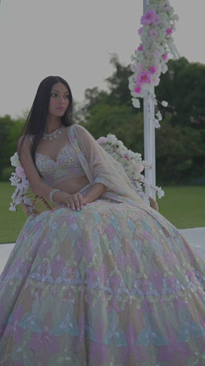 This lehenga set features intricate all over multi-coloured bead, sequin and crystal in a leaf pattern. This ensemble is paired with a scalloped blouse and a matching net dupatta.