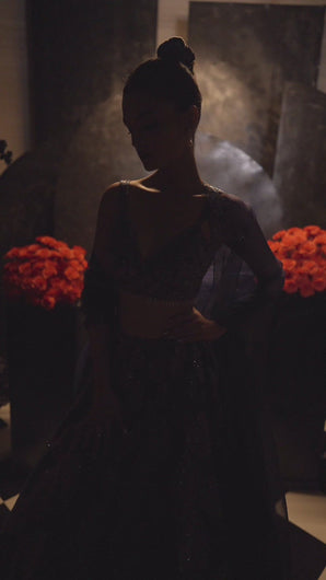 This navy lehenga set features all over crystal work in a floral pattern. The lehenga is paired with a studded blouse with tassels and a matching embroidered organza dupatta.