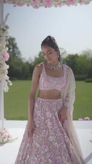 This nude lehenga set features three-dimensional embroidery and embellished flowers. The skirt is paired with a strappy blouse and an embroidered net dupatta.