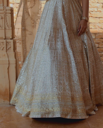 This contrasting lehenga set features traditonal gota patti embroidery on a pear green skirt and a blouse. the outfit is paired with embroidered peach tissue organza dupatta and comes with an optional belt that can be used for styling