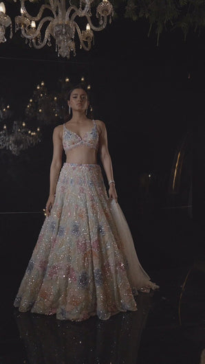 This lehenga set features all over multi-coloured floral embroidery on a pear green net base. The skirt is paired with a strappy blouse and an embroidered net dupatta.