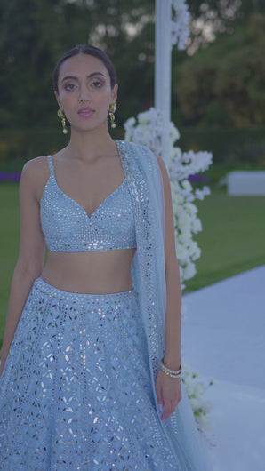 This powder blue lehenga set features all over mirror work embroidery on a net base. The lehenga comes with a fully embroidered blouse and matching net dupatta.