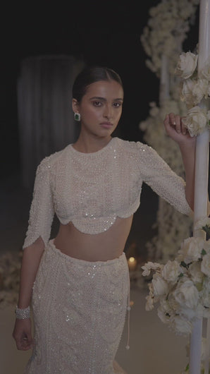 This fish cut lehenga set features intricate pearl, sequin and crystal embroidery on a powder peach net base. The ensemble is paired with a delicately scalloped blouse and an embroidered net dupatta.