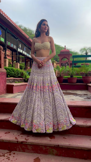 The Alara mermaid lehenga is our own version of a Cinderella Bride. It comes with a crystal tassel choli paired with intricate chevron and floral pattern metallic georgette lehenga.
